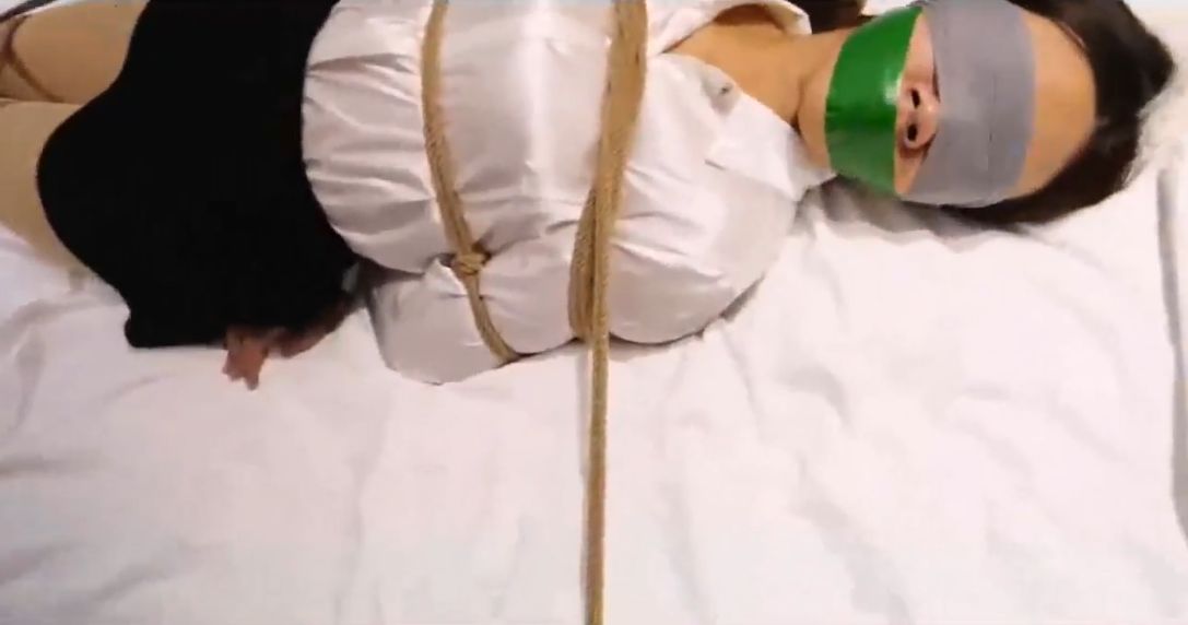 BDSM動画046:サテンブラウスベッド磔緊縛・目隠し・テープGAG・DID
